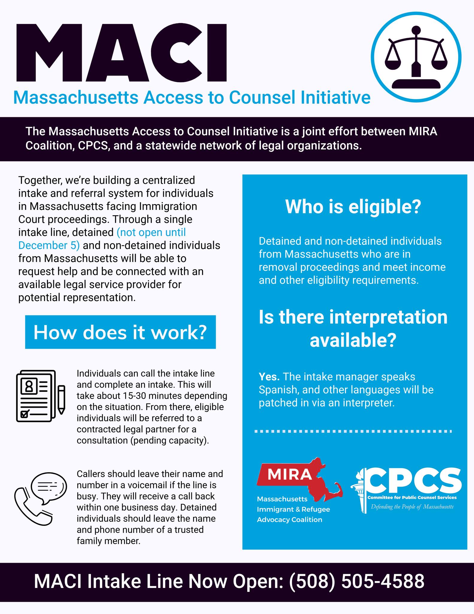 According to MIRA’s website the Access to Counsel Initiative launched late last year is “a joint effort between MIRA Coalition, CPCS, and a statewide network of legal organizations. Together, we’re building a centralized intake and referral system for individuals in Massachusetts facing Immigration Court proceedings. Through a single intake line, detained and non-detained individuals from Massachusetts will be able to request help and be connected with an available legal service provider for potential representation.”